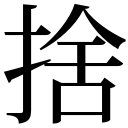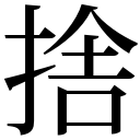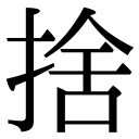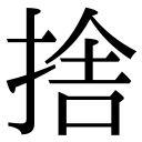 【卯集中】【手字部】 【唐韻】書冶切【集韻】【韻會】【正韻】始野切,𠀤赦上聲。【說文】釋也。【正韻】弃也。【宋書·殷淳傳】愛好文義,未嘗違捨。又姓。明洪武中,稅課大使捨敬。