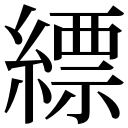 【未集中】【糸字部】 【廣韻】敷紹切【集韻】【韻會】匹紹切【正韻】普沼切,𠀤音醥。【說文】帛靑白色。【博雅】縹靑也。【釋名】縹猶漂。漂,淺靑色也。有碧縹,有天縹,有骨縹,各以其色所象言之也。【廣韻】靑黃色也。【後漢·輿服志】賈人縹緗而已。【楚辭·九懷】翠縹兮爲裳。又【集韻】匹妙切,音剽。義同。