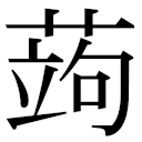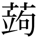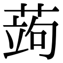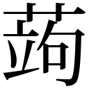 【申集上】【艸字部】 【唐韻】俱雨切【韻會】果羽切,𠀤音矩。【說文】果也。【本草】蒟醬。【南方草木狀】蒟醬,蓽茇也。生於番禺,小而靑,謂之蒟。【左思·蜀都賦註】蒟醬,緣樹而生,其子如桑椹,熟時正靑,長二三寸,以蜜藏而食之。【通志】蒟醬曰浮留。又【本草】蒟蒻一名鬼芋。【酉陽雜俎】蒟蒻,根大如椀,至秋葉滴露,隨滴生苗。