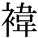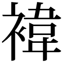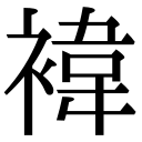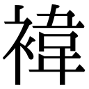【申集下】【衣字部】 【唐韻】許歸切【集韻】【韻會】吁韋切,𠀤音暉。【玉篇】后祭服也。【禮·玉藻】王后褘衣。【釋名】王后之上服曰褘衣,畫翟雉之文于衣也。伊洛而南,雉靑質五色備曰翬,鷂翬畫鷂雉之文于衣也。又【篇海】雨非切,音韋。【類篇】與幃同,囊也。【爾雅·釋器】婦人之褘謂之縭。【註】卽今之香纓也。褘邪交落帶繫于體,因名爲褘。